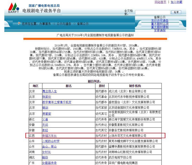 公司新作电视剧《幸福万年长》今日取得广电总局公示。欢迎有合作意向的单位与个人与我们联系。